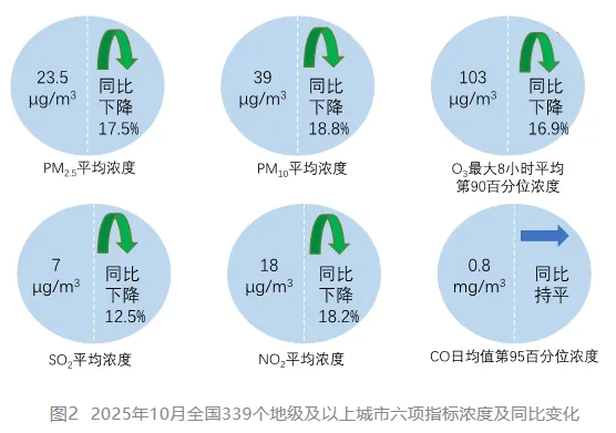 10月,全国339个地级及以上城市PM2.5平均浓度为23.5微克/立方米,同比下降17.5%;PM10平均浓度为39微克/立方米,同比下降18.8%;O3平均浓度为103微克/立方米,同比下降16.9%;SO2平均浓度为7微克/立方米,同比下降12.5%;NO2平均浓度为18微克/立方米,同比下降18.2%;CO平均浓度为0.8毫克/立方米,同比持平。