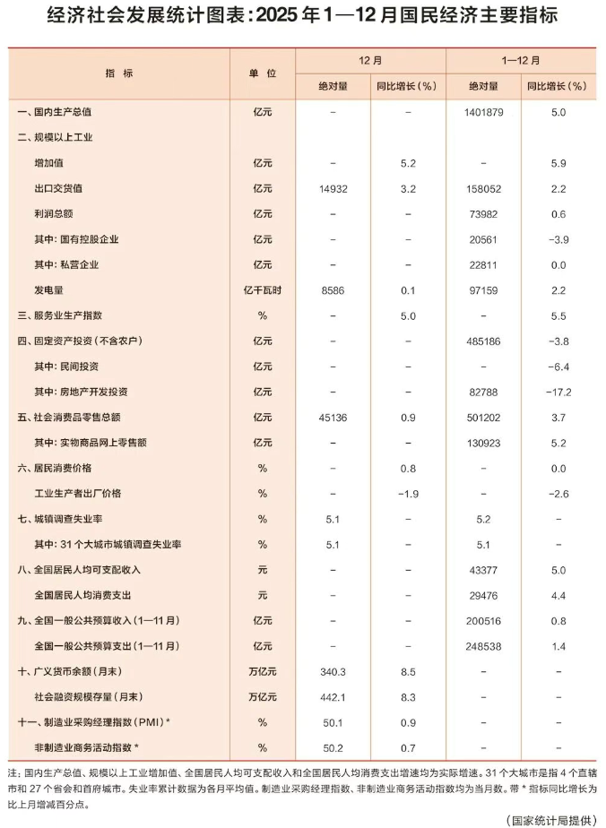 国家统计局 | 经济社会发展统计图表:2025年1—12月国民经济主要指标