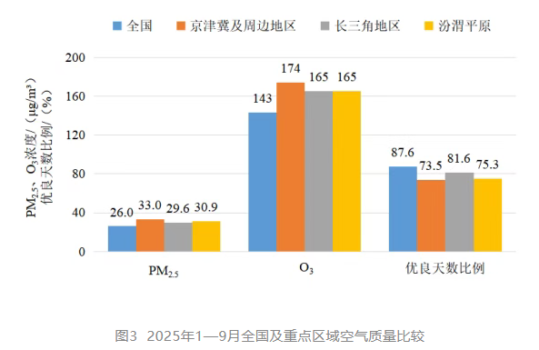 1—9月,京津冀及周边地区“2+36”城市PM2.5平均浓度为33.0微克/立方米,同比下降15.6%;O3平均浓度为174微克/立方米,同比下降7.0%;平均优良天数比例为73.5%,同比上升8.5个百分点;平均重度及以上污染天数比例为0.8%,同比下降1.2个百分点。由沙尘天气导致的平均超标天数比例为3.4%,其中重度及以上污染天数比例为0.3%。