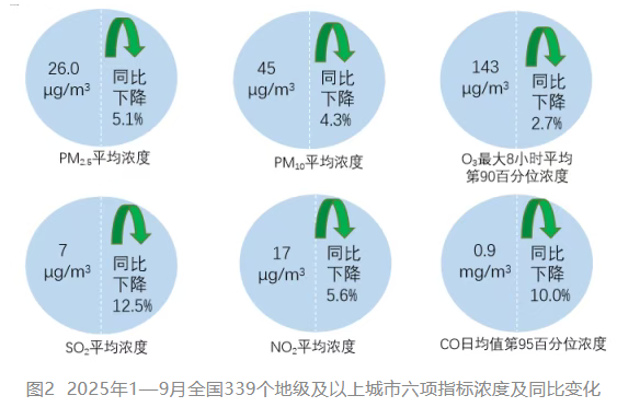1—9月,全国339个地级及以上城市PM2.5平均浓度为26.0微克/立方米,同比下降5.1%;PM10平均浓度为45微克/立方米,同比下降4.3%;O3平均浓度为143微克/立方米,同比下降2.7%;SO2平均浓度为7微克/立方米,同比下降12.5%;NO2平均浓度为17微克/立方米,同比下降5.6%;CO平均浓度为0.9毫克/立方米,同比下降10.0%。